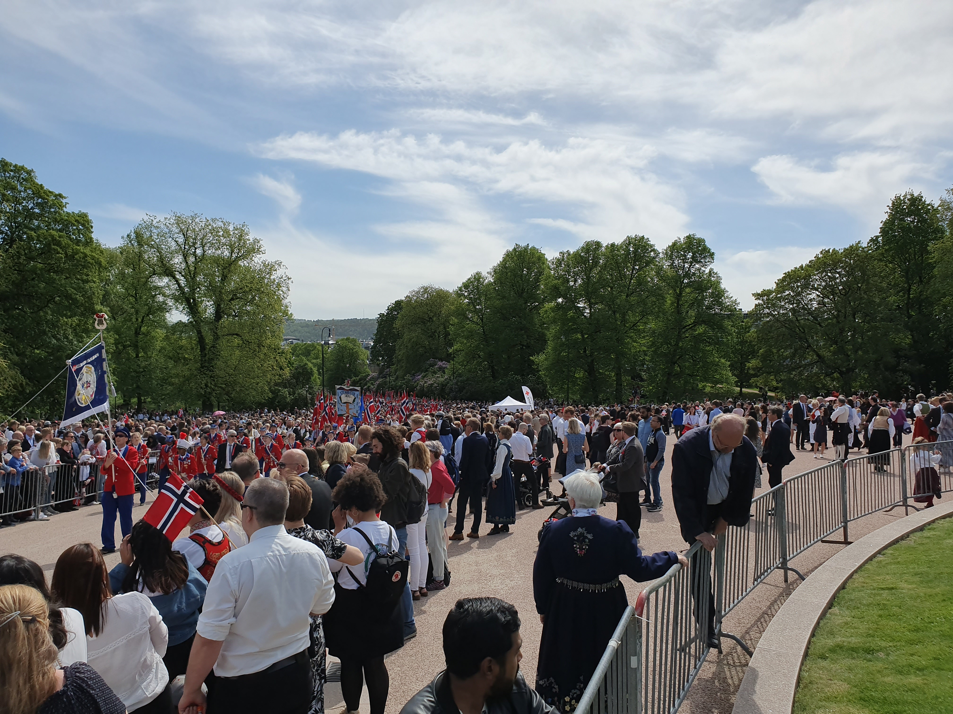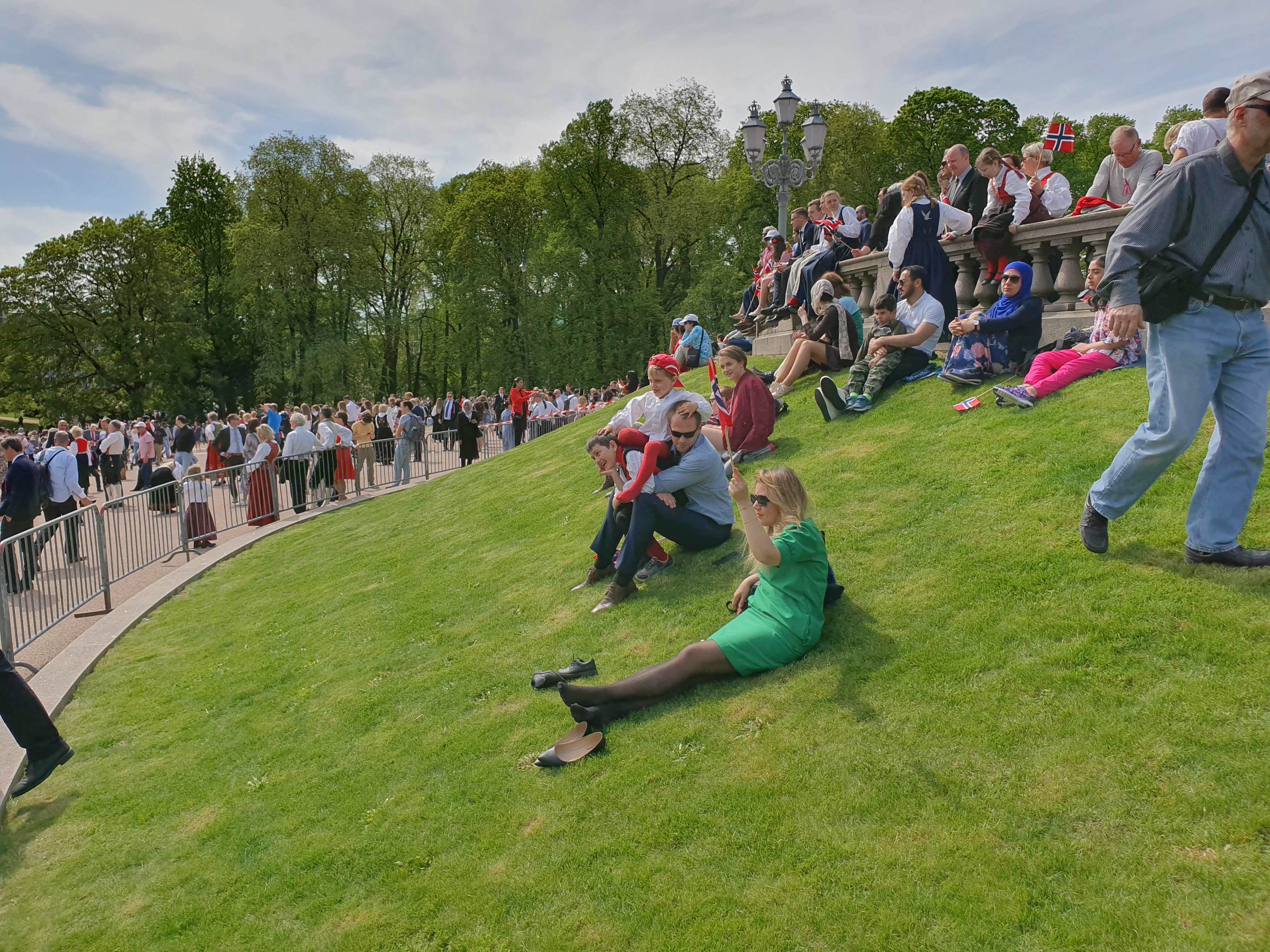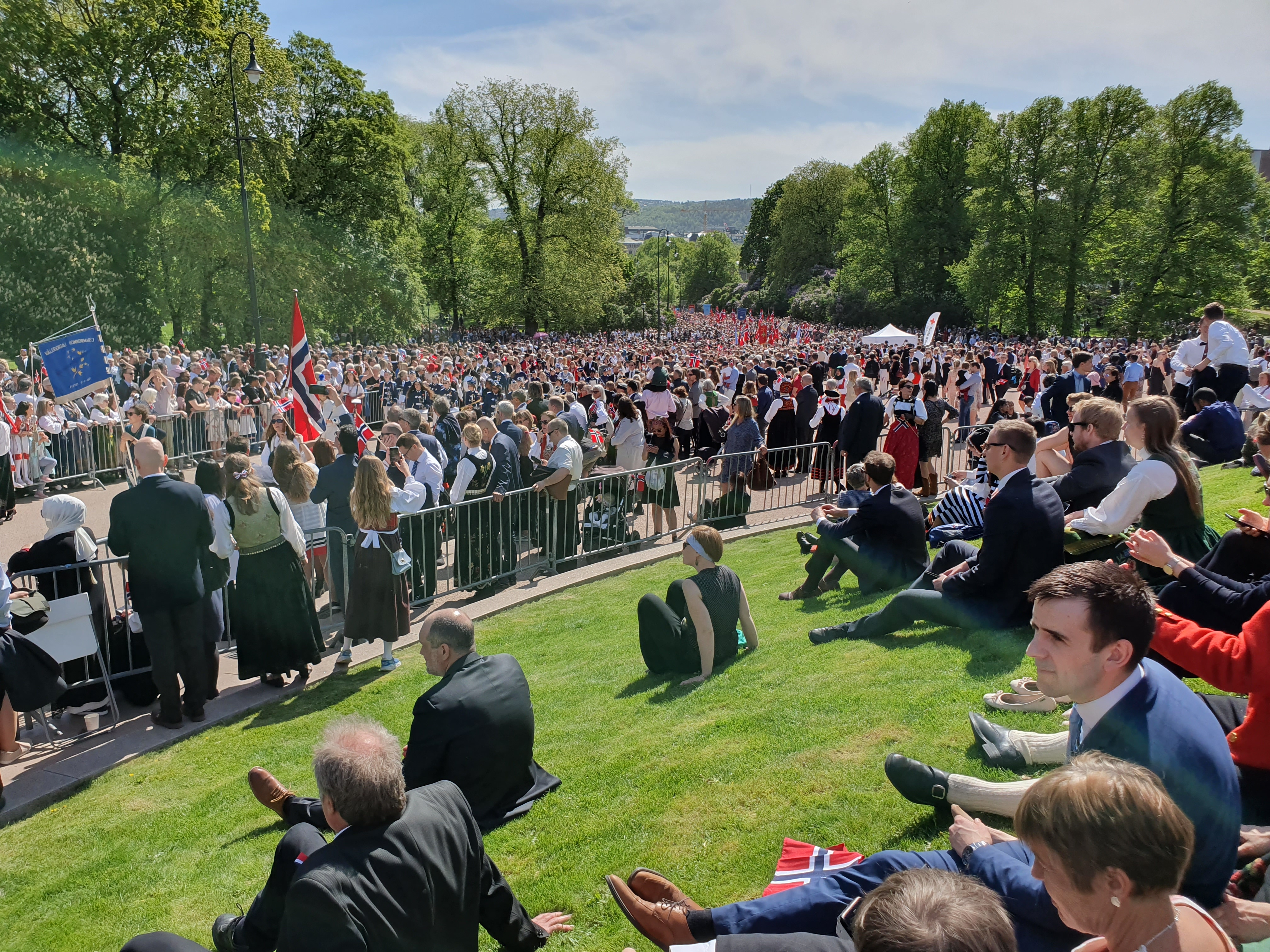 Her ser man fordelen med billetter, god plass og du kan bevege deg rundt og se både slottet, barnetogene og hele Karl Johans gate.