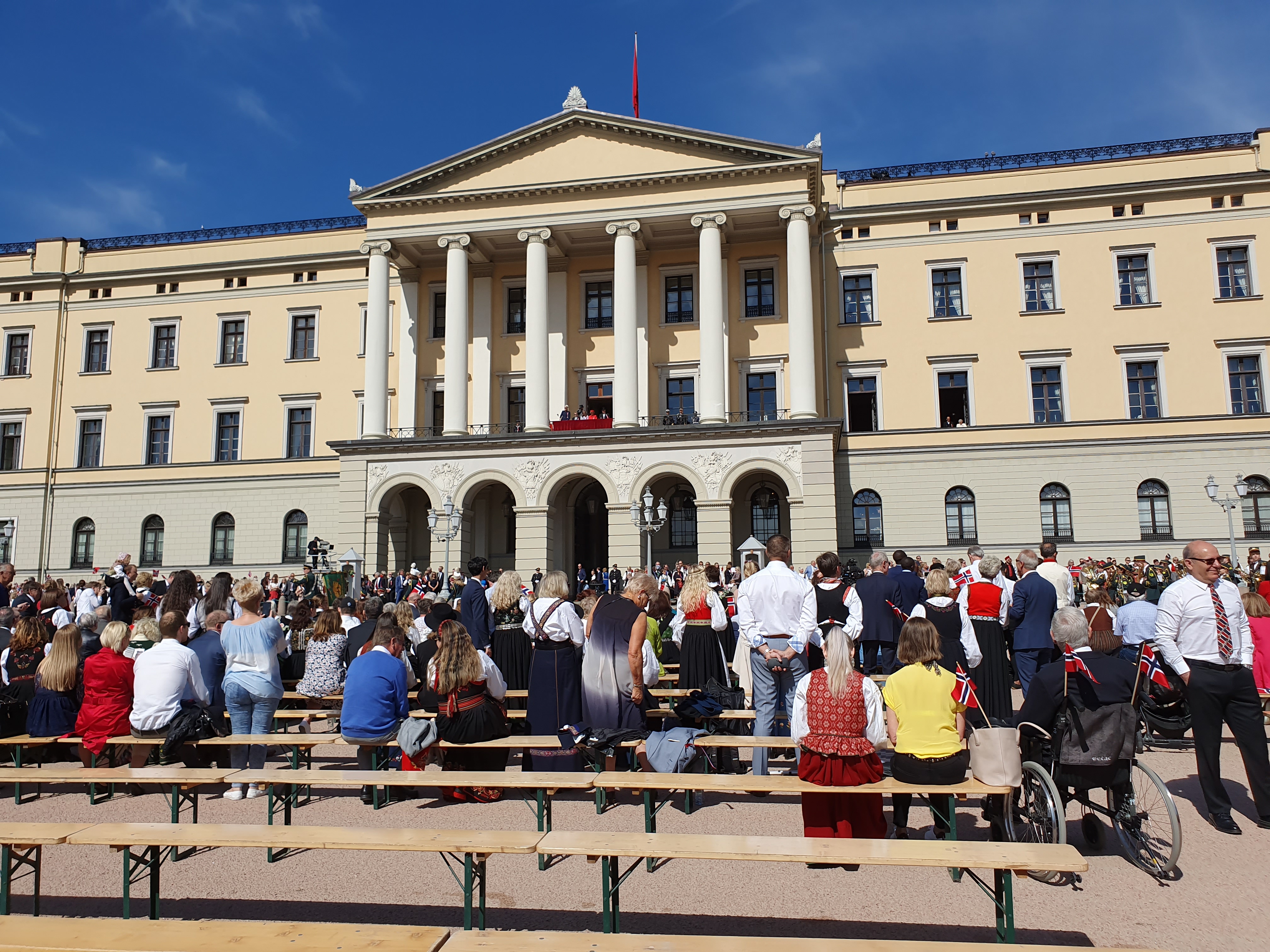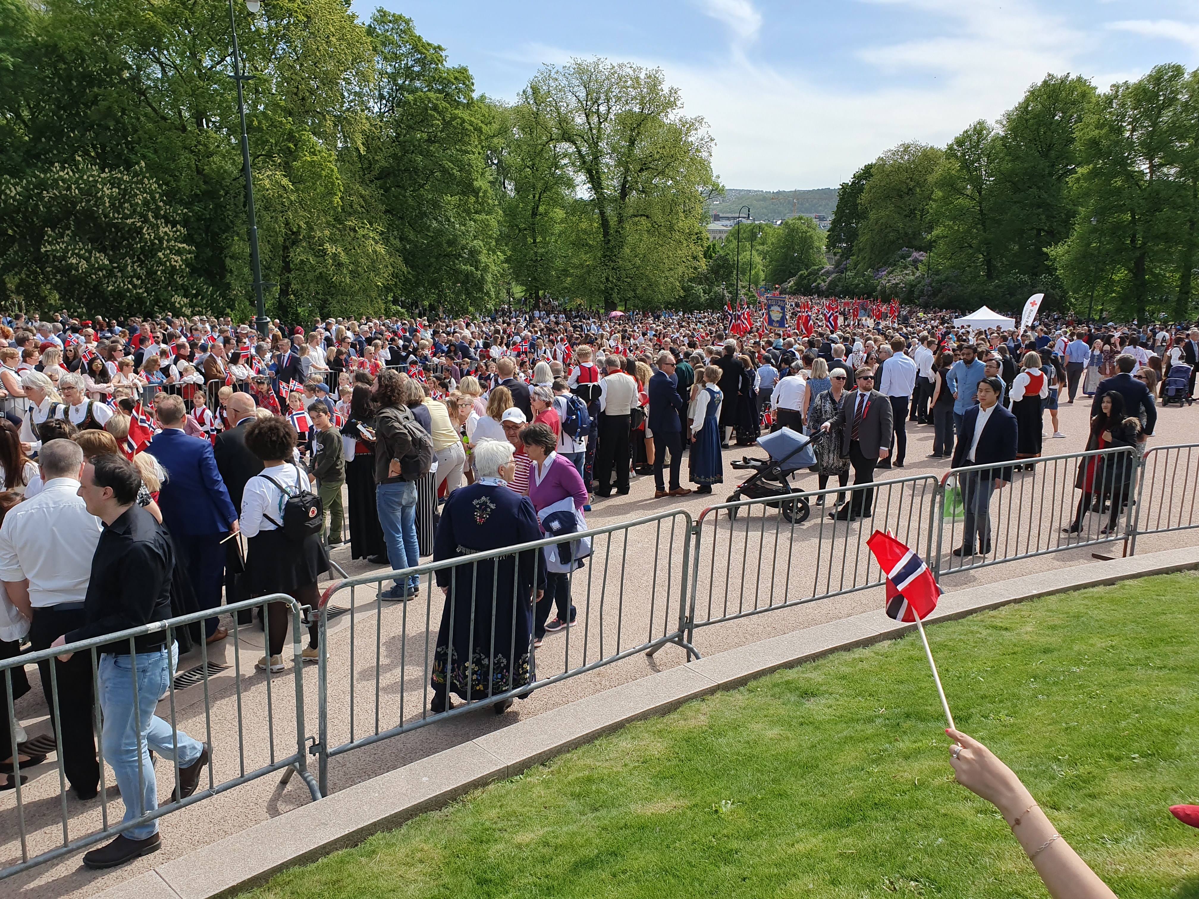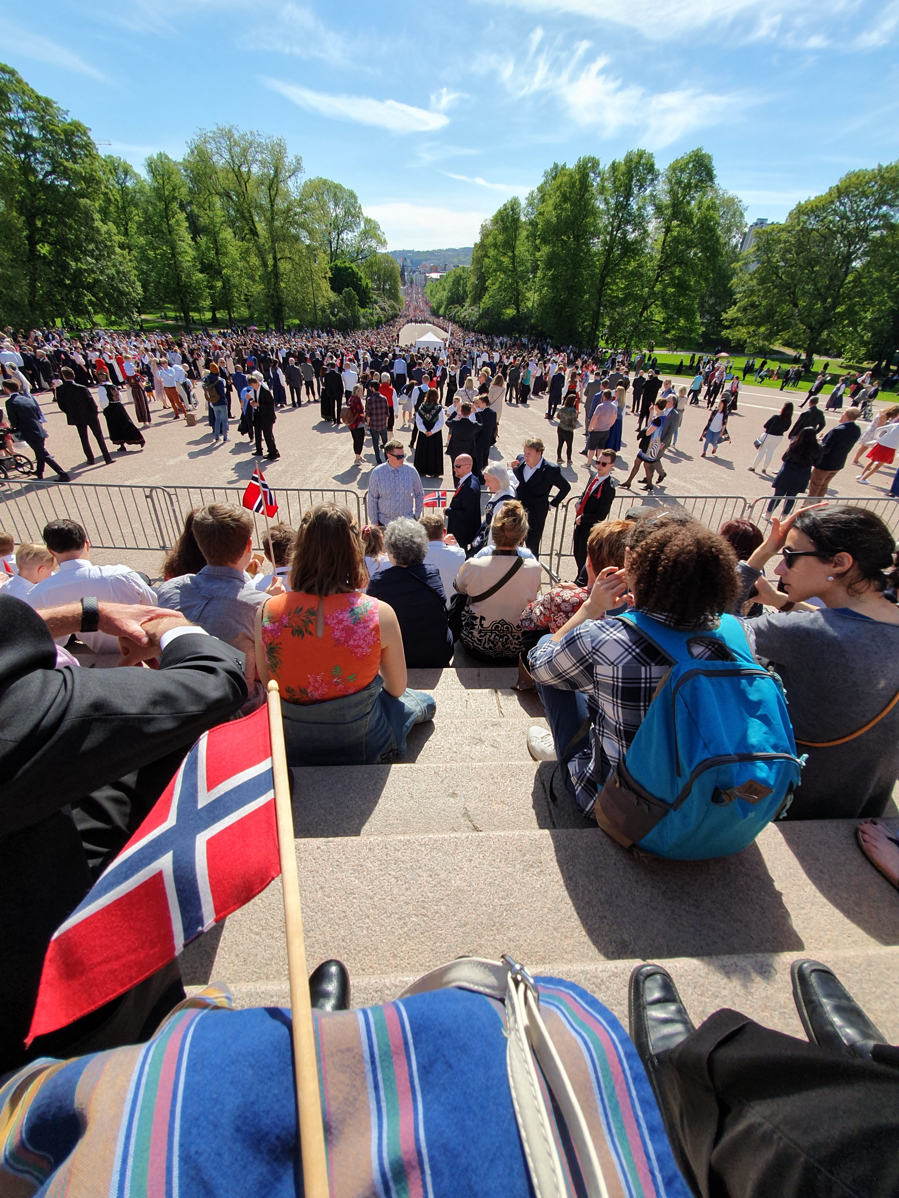 Her ser man fordelen med billetter, god plass og du kan bevege deg rundt og se både slottet, barnetogene og hele Karl Johans gate.