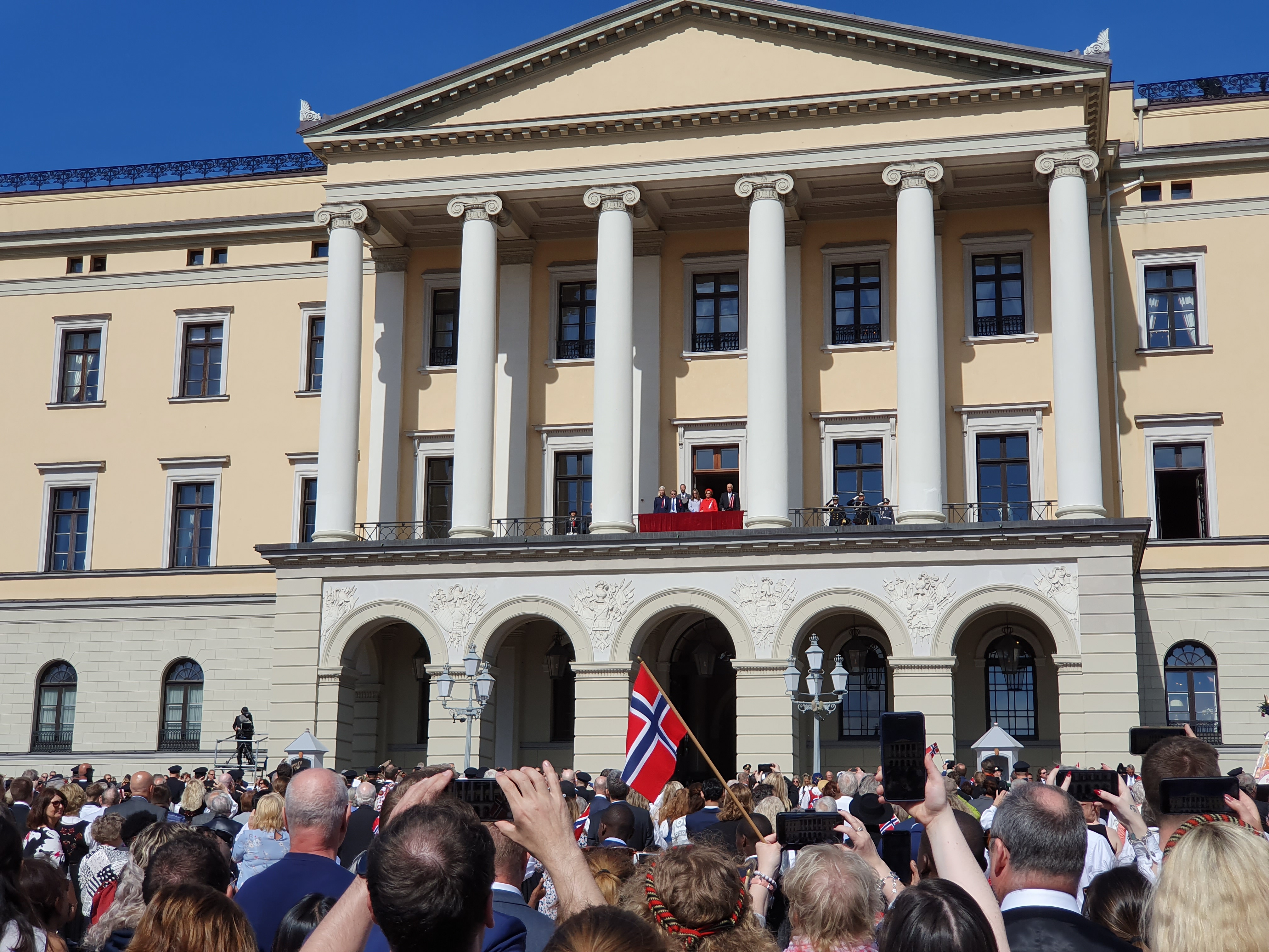 Og endelig fikk jeg oppleve å se den fantastiske kongefamilien vår! De var der alle sammen, der oppe på balkongen. I timesvis stod de (eller de satt mest sansynlig) å vinket til alle barnetogene som passerte slottsplassen på vei ned til rådhuset.