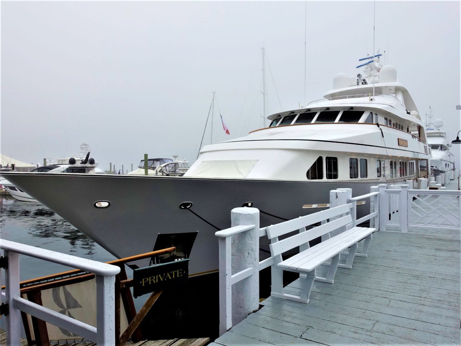 En helt normal båt i havna i Newport. Alle har sin egen inngang med påskriften «privat».